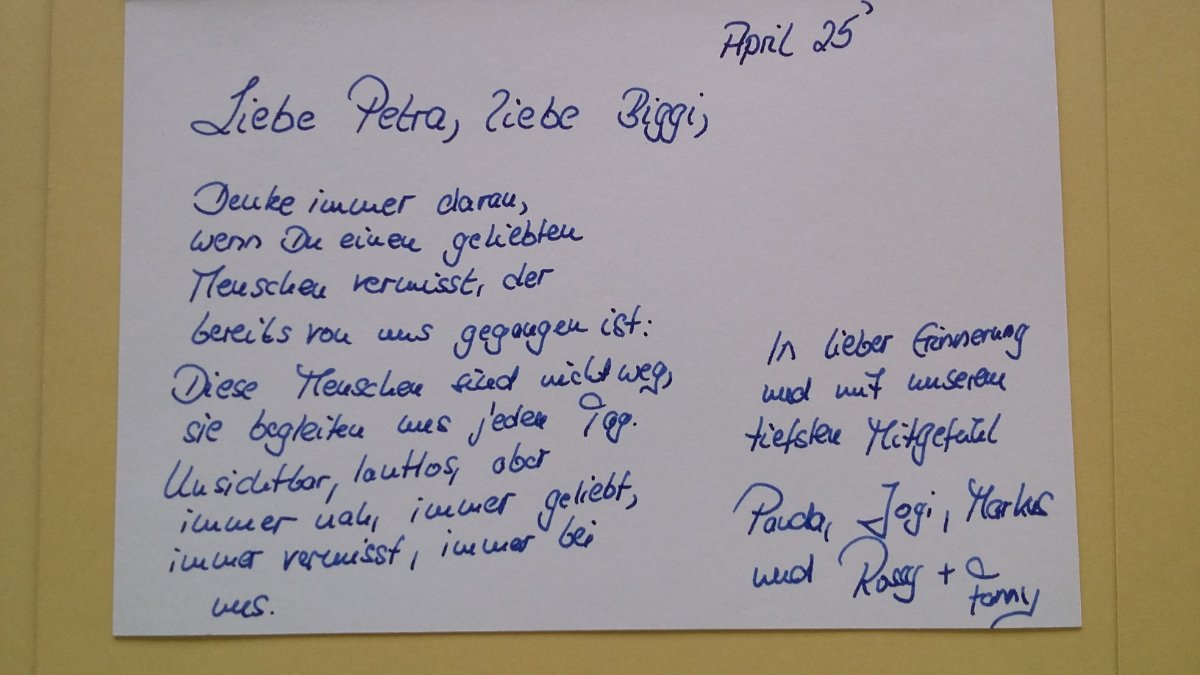 Zu deinem 91. Geburtstag letztes Jahr sind wir noch gemütlich in Schorndorf zusammengesessen. Du strahlst auf dem Foto und siehst so glücklich aus. Es tut so gut, dich so zu sehen. Ich bin froh, dass ich in den letzten Jahren so oft bei dir war, auch wenn ich gerne öfter gekommen wäre. Von diesen gemeinsamen Zeiten zehre ich jetzt. Im Herzen bist du immer bei mir.