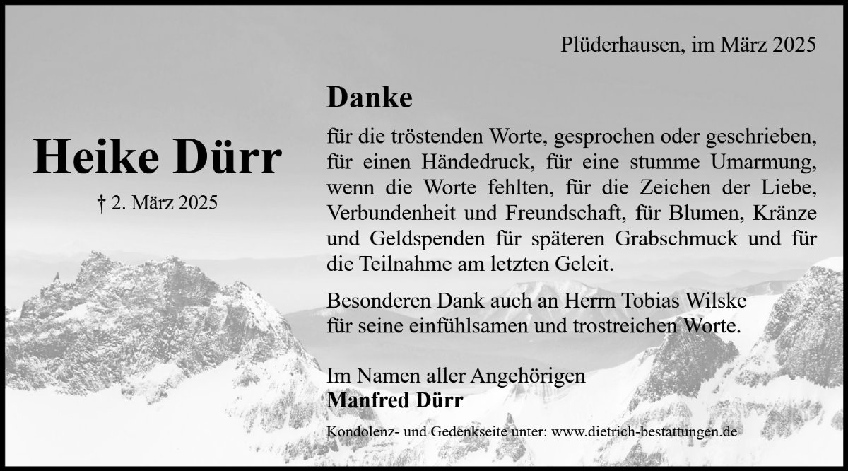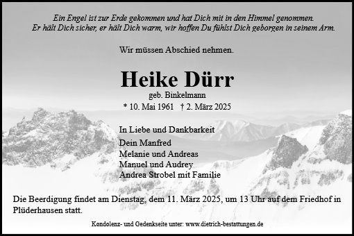 Heikes Sonne ist untergegangen und es wird nichts mehr so sein wie es war. Im Moment seid Ihr voll Trauer und Schmerz. Aber die Spuren, die Heike in Euren Herzen hinterlassen hat, werden helfen und trösten. Diese Spuren werden Euch immer begleiten. Wir wünschen Euch viel Kraft und Gottes Segen um alles zu verarbeiten.