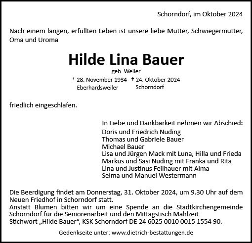 Mit großer Bestürzung haben wir vom Tod von Tante Hilde erfahren.