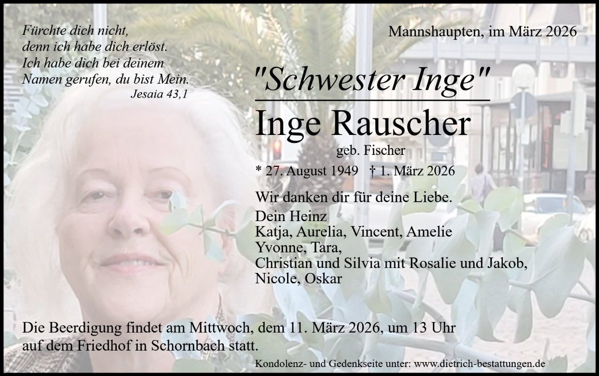 wir sind traurig betroffen über den Tod von Inge und möchten unsere ausdrückliche Anteilnahme aussprechen. Wir wünschen Euch allen viel Kraft und Gottes Segen, diesen Schmerz zu ertragen.