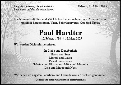 mittlerweile wohne ich in deiner Wohnung. Du fehlst an allen Ecken. Zu gerne wäre ich lieber noch in Schorndorf und hätte dich jede Woche besucht. Deine Weisheit begleitet mich jeden Tag. Ich bin kurz davor IT Architekt zu werden. Du hast immer gesagt, dass es dich so freuen würde. Wenn ich den Examen bestehe, dann widme ich Ihn dir. Den du hast immer an mich geglaubt, mich gestärkt und durch dich bin ich ein besserer Mensch geworden. Dein geliebter Sammy vermisst dich über alles. Wir passen auf deinen kleinen Schatz auf. Ihm geht es besser als uns allen...wie du es immer gesagt hast. Ich vermisse dich Opa...ohne dich ist mein Leben dunkler geworden aber ich freue mich, dass du Teil meines Lebens warst. Ich denke jeden Tag an dich. Aber ich bin glücklich das es dir nun besser geht. Ich weiß das du von oben auf mich aufpasst. Lieber hätte ich es gerne ein Bier mit dir zu trinken und einfach über alles zu reden. Das war immer unser Donnerstagsritual. Mir fehlt es sehr. Es war einfach immer schön mit dir. Du magst zwar nicht mehr da sein aber die Erinnerungen bleiben. Danke für alles Opa. Danke dass du mit deinen letzten Worten gesagt hast wie sehr du mich geliebt hast...das macht für mich die Situation erträglicher.