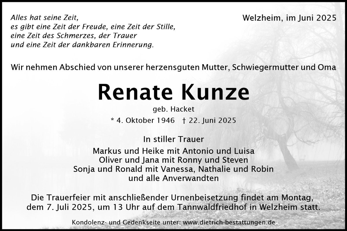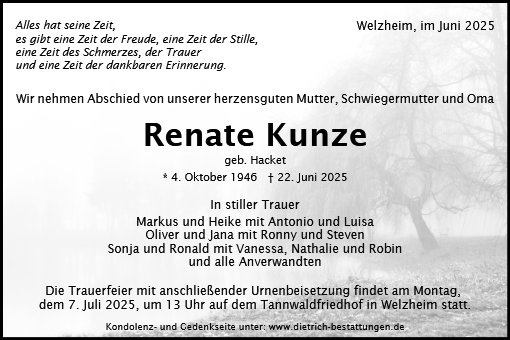 Ich behalte Renate als sehr liebenswert und offen in Erinnerung . Früher sassen wir an Geburtstagen bei Ursel oder Wolfgang zusammen und später haben wir immer ein Schwätzle in der Stadt gehalten. Das letzte Mal vor der Bäckerei Joos, noch gar nicht so lange her. Renate hat sich immer für meine Familie