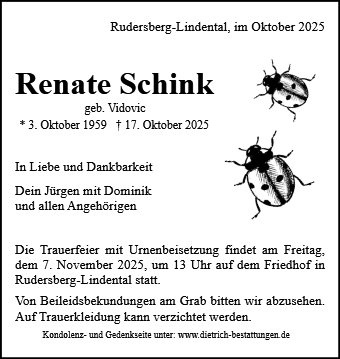 Lieber Jürgen und Dominik! Der plötzliche Tot von deiner lieben Frau Renate und Mutter von Dominik wünschen wir Euch unser tiefes Mitgefühl. In dieser Zeit der Dunkelheit und des Schmerzes tröstet nur die Dankbarkeit, dass wir so viele Jahre mit Ihr verbringen durften. Die Zeit heilt nicht alle Wunden, sie lehrt uns nur mit dem Unbegreiflichen zu leben. Unser Herzliches Beileid Gabi und Fritz