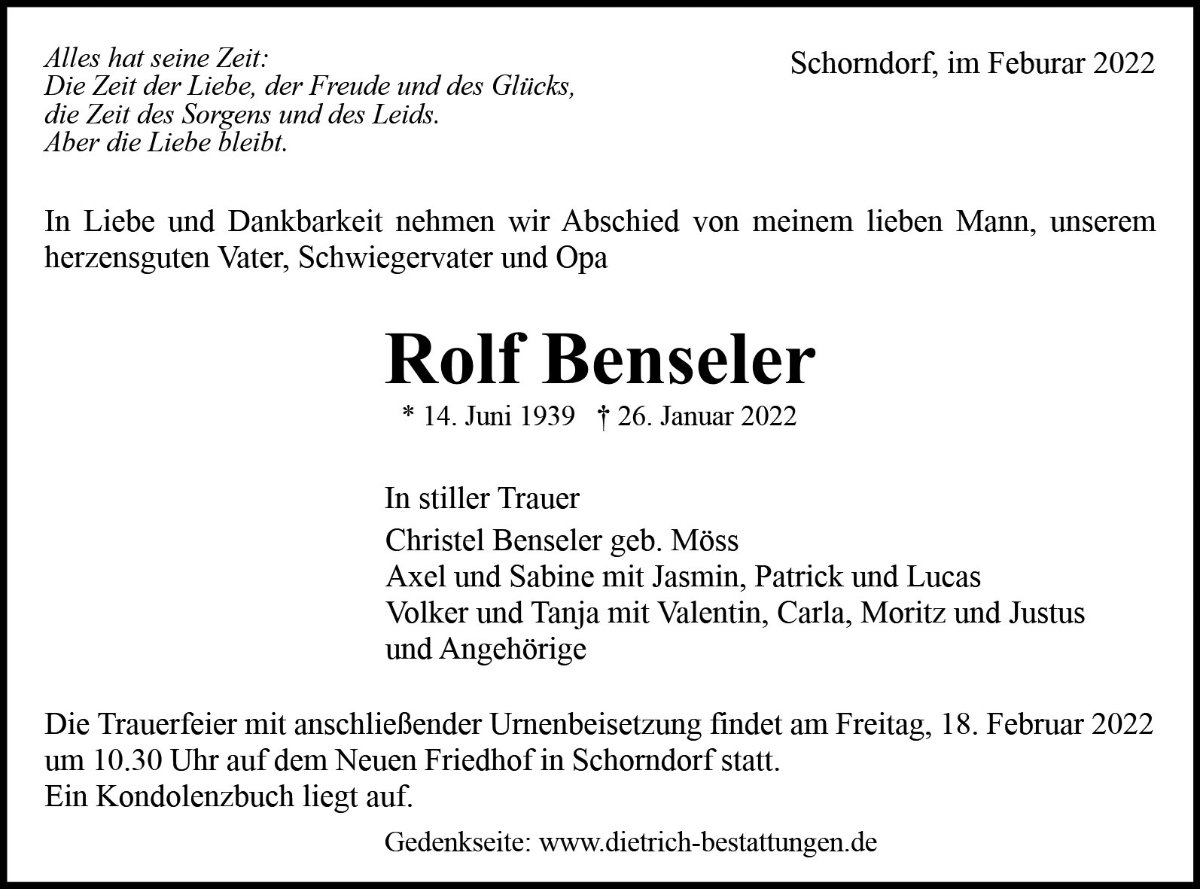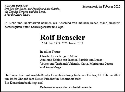 mit Bedauern habe ich aus der Zeitung von Rolfs Ableben erfahren. Mein aufrichtiges Beileid. Für mich lebt er in der Erinnerung weiter.Der Tod ist nur das Ende der leiblichen Existenz - aber gleichzeitig der Beginn eines Seins in einer anderen Dimension.